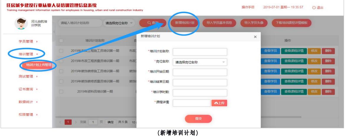 操作流程:点击【培训管理】-【培训计划上传管理】中,在主界面点击【新增培训计划】按 钮,填入培训计划名称、岗位名称、开始/结束日期、培训学时数和课程详情,提交即可生成计划,课程详情需要点 击【下载课程详情模板】按模板格式填写。