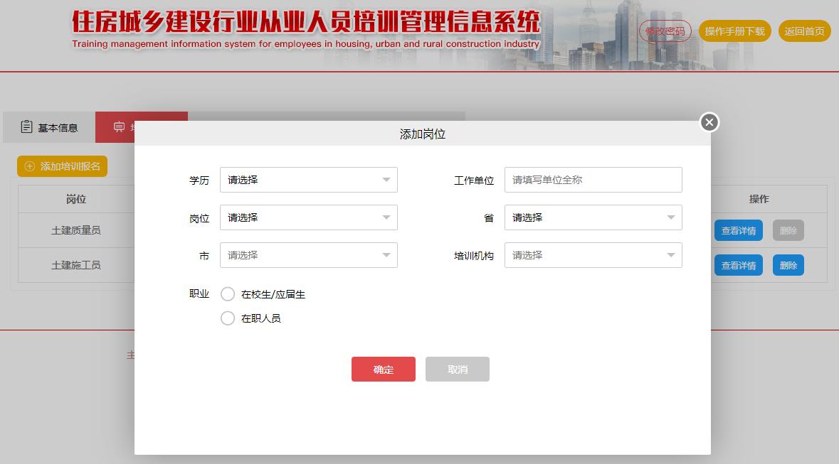 2.个人报名。个人登录住建部系统→用身份证号注册→完善个人基本信息→选择培训管理→添加培训报名,即可选择所要报名的岗位与培训机构。