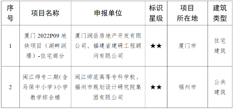 根据《绿色建筑标识管理办法》(建标规〔2021〕1号)和《福建省绿色建筑标识管理实施细则》(闽建〔2022〕7号)有关规定,省住建厅组织开展了2025年度第六批二星级绿色建筑标识项目认定工作。经项目单位申报、项目所在设区市住房和城乡建设主管部门推荐、省住建厅组织专家评审并向社会公示,确定厦门2022P09地块项目(湖畔润璟)-住宅部分、闽江师专二期(含马保中小学)小学教学综合楼2个项目获得二星级绿色建筑标识,现予公布。