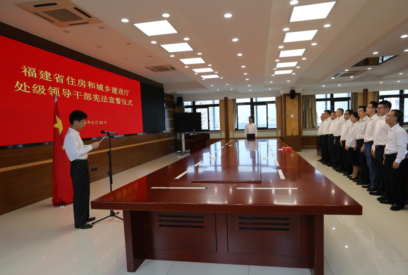 5月30日下午,省住房和城乡建设厅举行处级领导干部宪法宣誓仪式,受林瑞良厅长委托,蒋金明副厅长监誓。根据《福建省人民政府及其各部门任命的国家工作人员宪法宣誓实施办法》精神,卢文英等10名新任命的处级领导干部依法进行宪法宣誓。