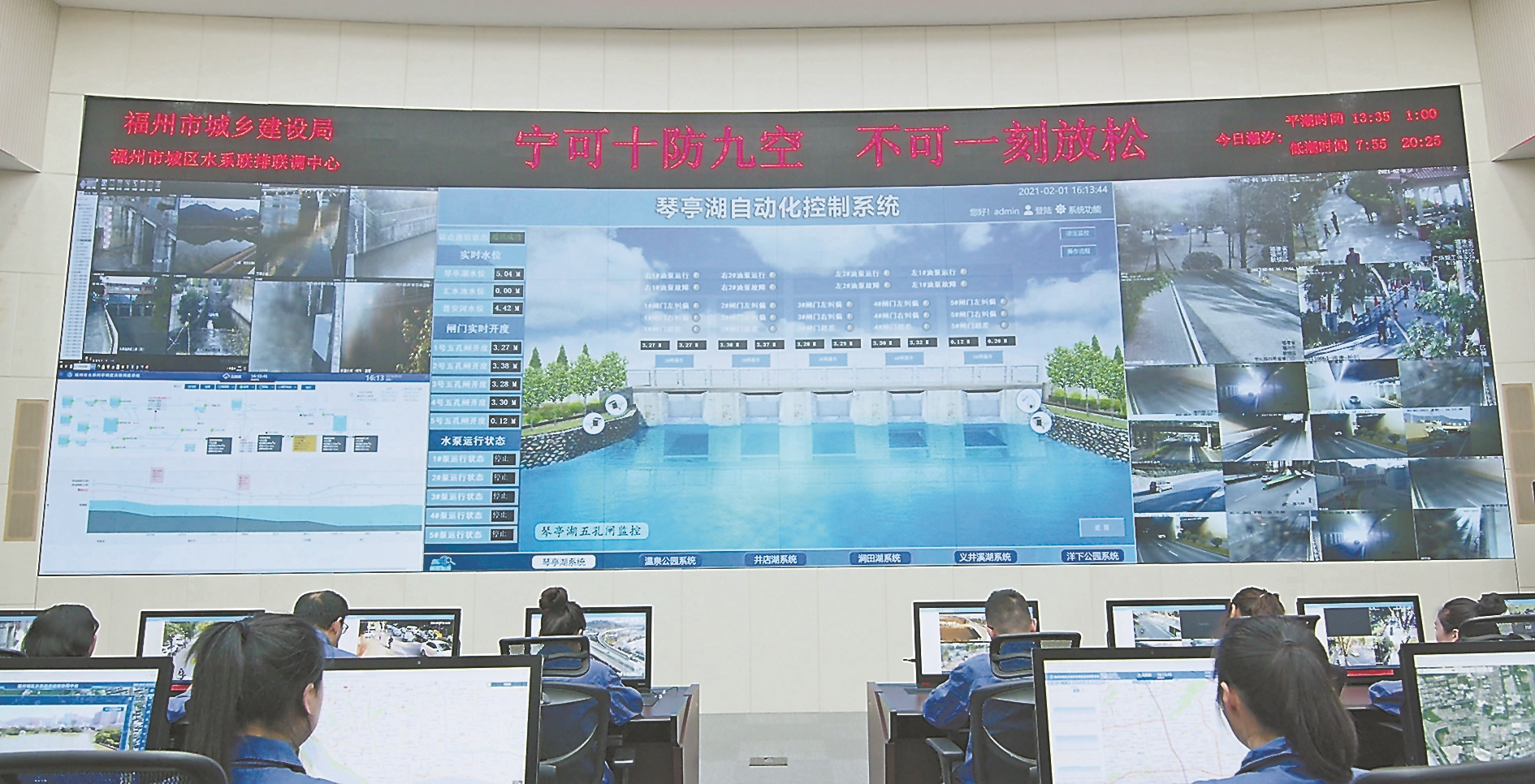 连日来,福州市城区水系联排联调中心的指挥大厅里,工作人员紧盯城区水系科学调度系统,实时调度。(受访者供图)