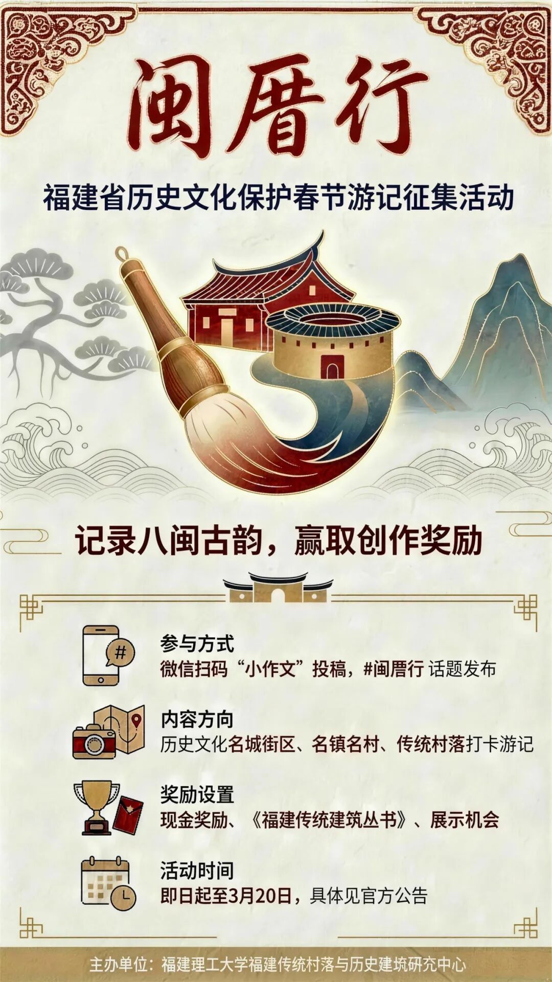 据介绍,参与该活动的人员只需记录在福建邂逅城乡历史文化保护利用的每一个瞬间,写下八闽游记“小作文”。如,“守护者日记”:偶遇了一位手艺精湛的传统建筑工匠师傅?或者听说了一个家族守护村子的故事?再如,“旧居新颜打卡记”:发现古厝变成了超有格调的咖啡馆、书店、民宿或美术馆?分享这份新旧碰撞的惊喜。又如,“人间烟火漫步指南”:在历史文化街区里迷路也是一种享受!哪家小吃最地道?哪个转角风景最好?或者,“非遗体验手账”:亲手试试传统手艺,参加一场民俗活动,记录下这独一无二的沉浸式体验。 据了解,此次征集对象包括天南海北的旅行者、游客,生活在福建、热爱家乡的本土“活地图”,擅长用镜头或文字讲述故事的创作者、博主、学生,单纯喜欢用手机记录生活点滴的普通人等。在抖音、小红书、微博、B站(Bilibili)、快手等任意平台发布原创游记作品,以“#闽厝行”为话题即可。作品可以“随手记、随手拍”等形式多维度呈现八闽名城街区、名镇名村和传统村落,结合福建各地历史文脉、农耕文明与地域文化,展现其独有的历史建筑、传统街巷、宅院民居及深厚文化底蕴,体现各地在保护传承与活化利用方面的实践,建议以文字为主,辅以图片、短视频等多媒体形式。作品发布后,请扫描下方二维码填写在线报名表即可。 作品评选将根据50%网络热度和50%专家评审决出名次,前者包括作品在平台上的点赞、评论、转发等真实互动数据,后者将邀请文化、旅游、传媒等领域的专家,从内容、创意和感染力等方面进行评审。最终决出一等奖5名、奖金1000元,二等奖10名、奖金500元,三等奖50名、奖金200元,入围奖若干,随机赠送《福建传统建筑丛书》。作品提交截止时间为2026年3月20日。