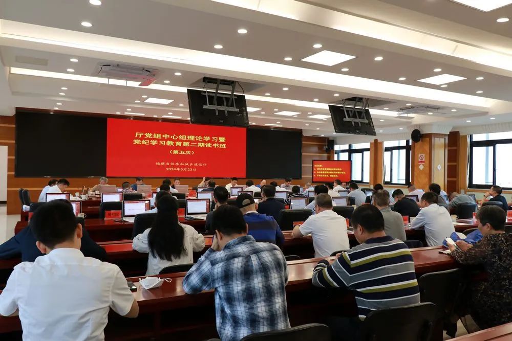 5月23日,省住建厅举办党纪学习教育第二期读书班暨厅党组理论学习中心组学习会。厅党组书记、厅长朱子君主持会议,厅领导、各处室及直属单位负责人(支部书记)、行业党委支部书记参加学习。