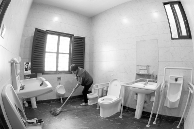 ①位于漳州古城内的漳南道巷公厕,保洁员打扫第三卫生间。