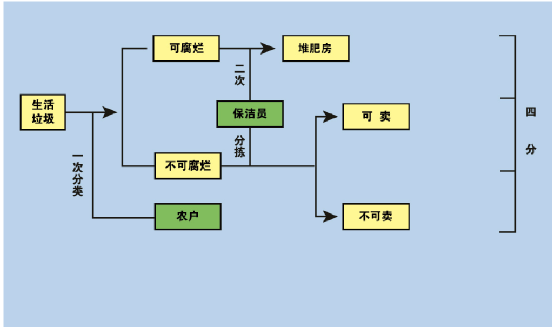 按可堆肥垃圾(可腐烂)、其他垃圾(不可腐烂)2类,由村保洁员用两格式分类收集车实行分类收集和运输。