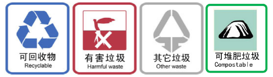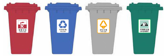 在广场、公园、活动中心等设立分类宣传公共垃圾桶,分为可堆肥垃圾、有害垃圾、可回收物、其他垃圾四类垃圾桶(如图3)。