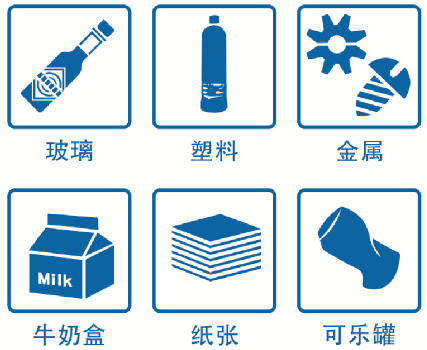 (2)可回收物:玻璃类(玻璃瓶罐、平板玻璃及其他玻璃制品等)、纸类(报纸、传单、杂志、纸板箱及其他未受污染的纸制品等)、金属类(铁、铜、铝等制品)、除塑料袋外的塑料制品类(泡沫塑料、塑料瓶、硬塑料等)、橡胶及橡胶制品、牛奶盒等包装、饮料瓶(可乐罐、塑料饮料瓶、啤酒瓶等)等。其分类种类见图6。